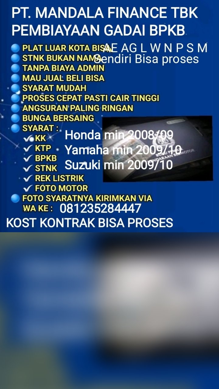 +PAJAK MATI MASIH BISA+PLAT L/W/N/M/S/P/AE/AG BISA+BPKB BELUM BALIK NAMA BISA+PLAT NOMER SE JAWA TIMUR+KTP LUAR KOTA BISA+RUMAH KONTRAK/KOST BISA+TANPA HARUS PUNYA USAHA